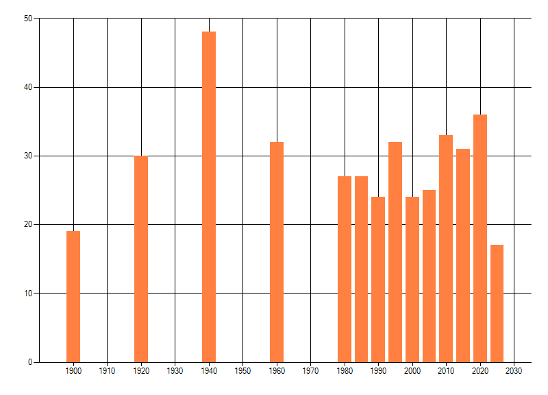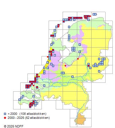 Het aantal atlasblokken (5x5 km) waarin de soort is gemeld binnen een periode van vijf jaar (vanaf 1980) of twintig jaar. Niet gecorrigeerd voor waarnemersinspanning en het aantal doorgegeven waarnemingen kan sterk variƫren per periode, dus een trend in verspreiding kan hier niet direct uit worden afgelezen. Het opgegeven jaartal is het eerste jaar van de periode. Bron: gevalideerde waarnemingen uit de NDFF.