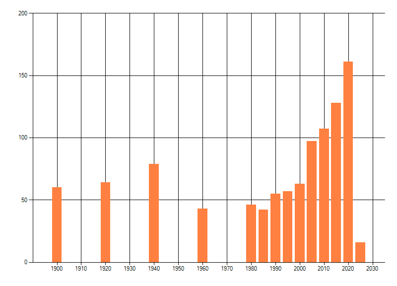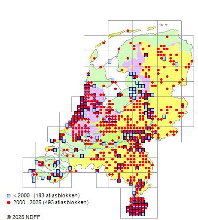 Het aantal atlasblokken (5x5 km) waarin de soort is gemeld binnen een periode van vijf jaar (vanaf 1980) of twintig jaar. Niet gecorrigeerd voor waarnemersinspanning en het aantal doorgegeven waarnemingen kan sterk variëren per periode, dus een trend in verspreiding kan hier niet direct uit worden afgelezen. Het opgegeven jaartal is het eerste jaar van de periode. Bron: gevalideerde waarnemingen uit de NDFF.