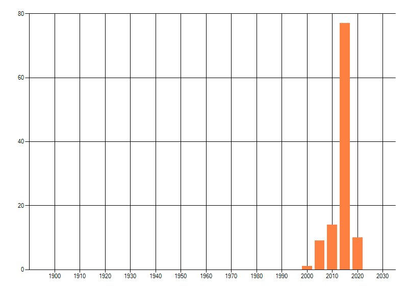 Het aantal atlasblokken (5x5 km) waarin de soort is gemeld binnen een periode van vijf jaar (vanaf 1980) of twintig jaar. Niet gecorrigeerd voor waarnemersinspanning en het aantal doorgegeven waarnemingen kan sterk variëren per periode, dus een trend in verspreiding kan hier niet direct uit worden afgelezen. Het opgegeven jaartal is het eerste jaar van de periode. Bron: gevalideerde waarnemingen uit de NDFF.