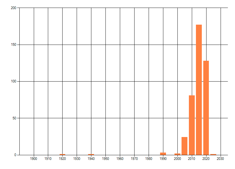 Het aantal atlasblokken (5x5 km) waarin de soort is gemeld binnen een periode van vijf jaar (vanaf 1980) of twintig jaar. Niet gecorrigeerd voor waarnemersinspanning en het aantal doorgegeven waarnemingen kan sterk variëren per periode, dus een trend in verspreiding kan hier niet direct uit worden afgelezen. Het opgegeven jaartal is het eerste jaar van de periode. Bron: gevalideerde waarnemingen uit de NDFF.