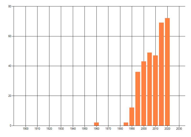 Het aantal atlasblokken (5x5 km) waarin de soort is gemeld binnen een periode van vijf jaar (vanaf 1980) of twintig jaar. Niet gecorrigeerd voor waarnemersinspanning en het aantal doorgegeven waarnemingen kan sterk variëren per periode, dus een trend in verspreiding kan hier niet direct uit worden afgelezen. Het opgegeven jaartal is het eerste jaar van de periode. Bron: gevalideerde waarnemingen uit de NDFF.