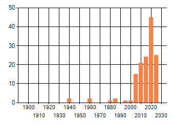Het aantal atlasblokken (5x5 km) waarin de soort is gemeld binnen een periode van vijf jaar (vanaf 1980) of twintig jaar. Niet gecorrigeerd voor waarnemersinspanning en het aantal doorgegeven waarnemingen kan sterk variëren per periode, dus een trend in verspreiding kan hier niet direct uit worden afgelezen. Het opgegeven jaartal is het eerste jaar van de periode. Bron: gevalideerde waarnemingen uit de NDFF.