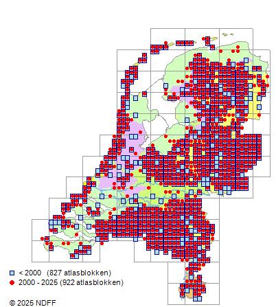 Het aantal atlasblokken (5x5 km) waarin de soort is gemeld binnen een periode van vijf jaar (vanaf 1980) of twintig jaar. Niet gecorrigeerd voor waarnemersinspanning en het aantal doorgegeven waarnemingen kan sterk variƫren per periode, dus een trend in verspreiding kan hier niet direct uit worden afgelezen. Het opgegeven jaartal is het eerste jaar van de periode. Bron: gevalideerde waarnemingen uit de NDFF.