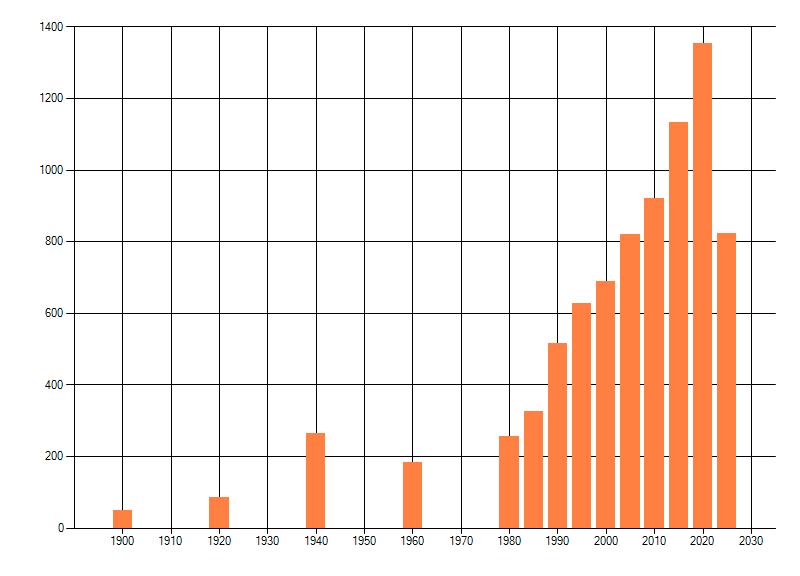 Het aantal atlasblokken (5x5 km) waarin de soort is gemeld binnen een periode van vijf jaar (vanaf 1980) of twintig jaar. Niet gecorrigeerd voor waarnemersinspanning en het aantal doorgegeven waarnemingen kan sterk variƫren per periode, dus een trend in verspreiding kan hier niet direct uit worden afgelezen. Het opgegeven jaartal is het eerste jaar van de periode. Bron: gevalideerde waarnemingen uit de NDFF.