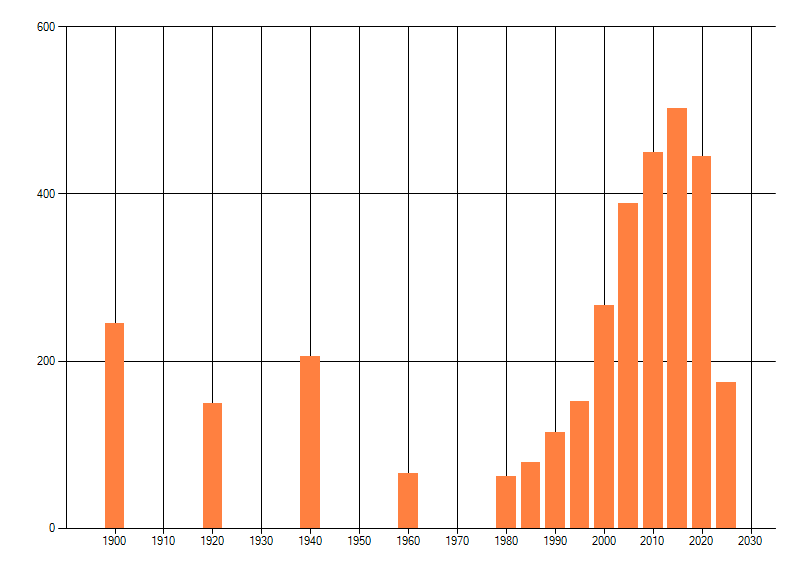Het aantal atlasblokken (5x5 km) waarin de soort is gemeld binnen een periode van vijf jaar (vanaf 1980) of twintig jaar. Niet gecorrigeerd voor waarnemersinspanning en het aantal doorgegeven waarnemingen kan sterk variƫren per periode, dus een trend in verspreiding kan hier niet direct uit worden afgelezen. Het opgegeven jaartal is het eerste jaar van de periode. Bron: gevalideerde waarnemingen uit de NDFF.