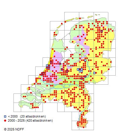 Het aantal atlasblokken (5x5 km) waarin de soort is gemeld binnen een periode van vijf jaar (vanaf 1980) of twintig jaar. Niet gecorrigeerd voor waarnemersinspanning en het aantal doorgegeven waarnemingen kan sterk variëren per periode, dus een trend in verspreiding kan hier niet direct uit worden afgelezen. Het opgegeven jaartal is het eerste jaar van de periode. Bron: gevalideerde waarnemingen uit de NDFF.