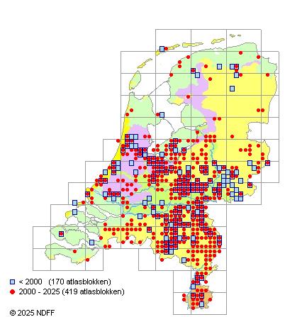 Het aantal atlasblokken (5x5 km) waarin de soort is gemeld binnen een periode van vijf jaar (vanaf 1980) of twintig jaar. Niet gecorrigeerd voor waarnemersinspanning en het aantal doorgegeven waarnemingen kan sterk variëren per periode, dus een trend in verspreiding kan hier niet direct uit worden afgelezen. Het opgegeven jaartal is het eerste jaar van de periode. Bron: gevalideerde waarnemingen uit de NDFF.