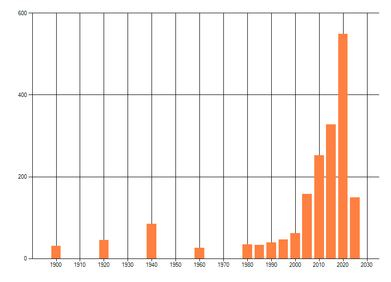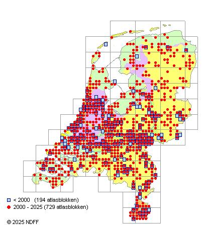 Het aantal atlasblokken (5x5 km) waarin de soort is gemeld binnen een periode van vijf jaar (vanaf 1980) of twintig jaar. Niet gecorrigeerd voor waarnemersinspanning en het aantal doorgegeven waarnemingen kan sterk variëren per periode, dus een trend in verspreiding kan hier niet direct uit worden afgelezen. Het opgegeven jaartal is het eerste jaar van de periode. Bron: gevalideerde waarnemingen uit de NDFF.