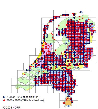 Het aantal atlasblokken (5x5 km) waarin de soort is gemeld binnen een periode van vijf jaar (vanaf 1980) of twintig jaar. Niet gecorrigeerd voor waarnemersinspanning en het aantal doorgegeven waarnemingen kan sterk variëren per periode, dus een trend in verspreiding kan hier niet direct uit worden afgelezen. Het opgegeven jaartal is het eerste jaar van de periode. Bron: gevalideerde waarnemingen uit de NDFF.