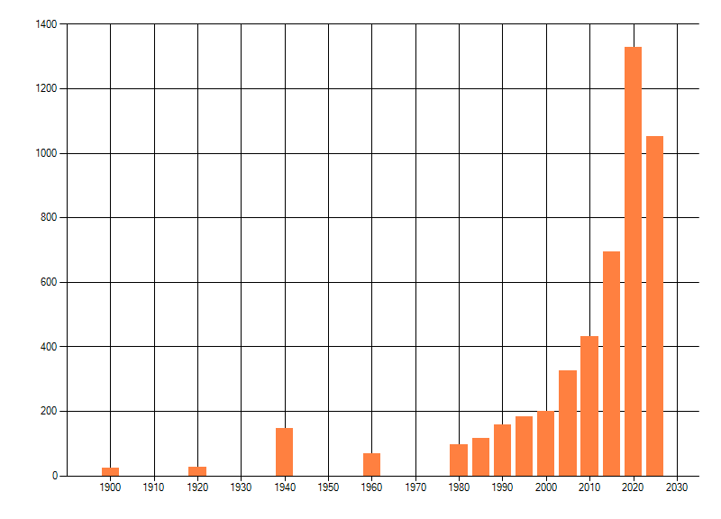 Het aantal atlasblokken (5x5 km) waarin de soort is gemeld binnen een periode van vijf jaar (vanaf 1980) of twintig jaar. Niet gecorrigeerd voor waarnemersinspanning en het aantal doorgegeven waarnemingen kan sterk variëren per periode, dus een trend in verspreiding kan hier niet direct uit worden afgelezen. Het opgegeven jaartal is het eerste jaar van de periode. Bron: gevalideerde waarnemingen uit de NDFF.