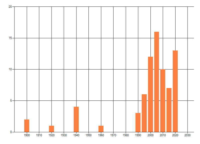 Het aantal atlasblokken (5x5 km) waarin de soort is gemeld binnen een periode van vijf jaar (vanaf 1980) of twintig jaar. Niet gecorrigeerd voor waarnemersinspanning en het aantal doorgegeven waarnemingen kan sterk variëren per periode, dus een trend in verspreiding kan hier niet direct uit worden afgelezen. Het opgegeven jaartal is het eerste jaar van de periode. Bron: gevalideerde waarnemingen uit de NDFF.