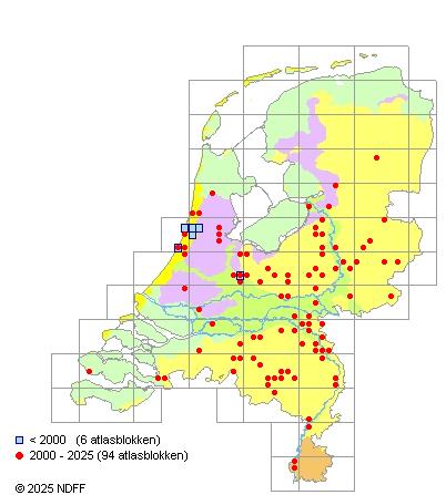 Het aantal atlasblokken (5x5 km) waarin de soort is gemeld binnen een periode van vijf jaar (vanaf 1980) of twintig jaar. Niet gecorrigeerd voor waarnemersinspanning en het aantal doorgegeven waarnemingen kan sterk variëren per periode, dus een trend in verspreiding kan hier niet direct uit worden afgelezen. Het opgegeven jaartal is het eerste jaar van de periode. Bron: gevalideerde waarnemingen uit de NDFF.