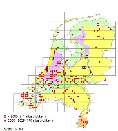 Het aantal atlasblokken (5x5 km) waarin de soort is gemeld binnen een periode van vijf jaar (vanaf 1980) of twintig jaar. Niet gecorrigeerd voor waarnemersinspanning en het aantal doorgegeven waarnemingen kan sterk variëren per periode, dus een trend in verspreiding kan hier niet direct uit worden afgelezen. Het opgegeven jaartal is het eerste jaar van de periode. Bron: gevalideerde waarnemingen uit de NDFF.