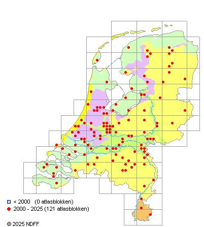 Het aantal atlasblokken (5x5 km) waarin de soort is gemeld binnen een periode van vijf jaar (vanaf 1980) of twintig jaar. Niet gecorrigeerd voor waarnemersinspanning en het aantal doorgegeven waarnemingen kan sterk variëren per periode, dus een trend in verspreiding kan hier niet direct uit worden afgelezen. Het opgegeven jaartal is het eerste jaar van de periode. Bron: gevalideerde waarnemingen uit de NDFF.