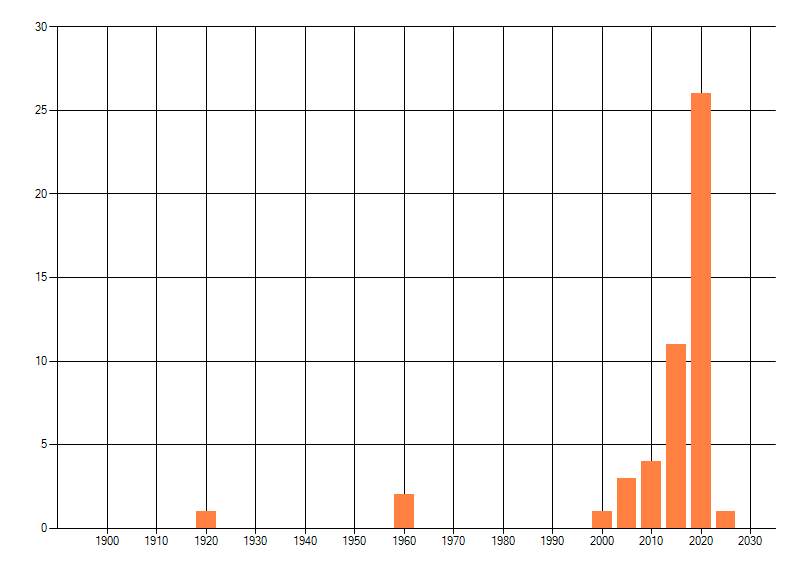 Het aantal atlasblokken (5x5 km) waarin de soort is gemeld binnen een periode van vijf jaar (vanaf 1980) of twintig jaar. Niet gecorrigeerd voor waarnemersinspanning en het aantal doorgegeven waarnemingen kan sterk variëren per periode, dus een trend in verspreiding kan hier niet direct uit worden afgelezen. Het opgegeven jaartal is het eerste jaar van de periode. Bron: gevalideerde waarnemingen uit de NDFF.