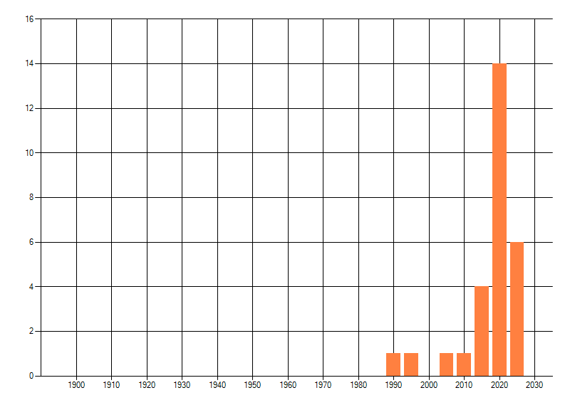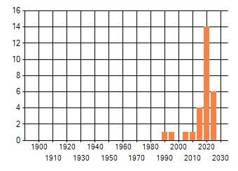 Het aantal atlasblokken (5x5 km) waarin de soort is gemeld binnen een periode van vijf jaar (vanaf 1980) of twintig jaar. Niet gecorrigeerd voor waarnemersinspanning en het aantal doorgegeven waarnemingen kan sterk variëren per periode, dus een trend in verspreiding kan hier niet direct uit worden afgelezen. Het opgegeven jaartal is het eerste jaar van de periode. Bron: gevalideerde waarnemingen uit de NDFF.