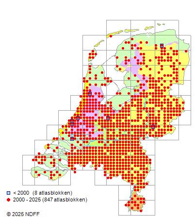 Het aantal atlasblokken (5x5 km) waarin de soort is gemeld binnen een periode van vijf jaar (vanaf 1980) of twintig jaar. Niet gecorrigeerd voor waarnemersinspanning en het aantal doorgegeven waarnemingen kan sterk variƫren per periode, dus een trend in verspreiding kan hier niet direct uit worden afgelezen. Het opgegeven jaartal is het eerste jaar van de periode. Bron: gevalideerde waarnemingen uit de NDFF.