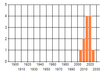 Het aantal atlasblokken (5x5 km) waarin de soort is gemeld binnen een periode van vijf jaar (vanaf 1980) of twintig jaar. Niet gecorrigeerd voor waarnemersinspanning en het aantal doorgegeven waarnemingen kan sterk variëren per periode, dus een trend in verspreiding kan hier niet direct uit worden afgelezen. Het opgegeven jaartal is het eerste jaar van de periode. Bron: gevalideerde waarnemingen uit de NDFF.