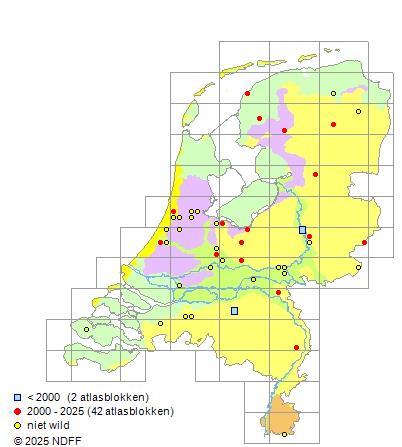 Het aantal atlasblokken (5x5 km) waarin de soort is gemeld binnen een periode van vijf jaar (vanaf 1980) of twintig jaar. Niet gecorrigeerd voor waarnemersinspanning en het aantal doorgegeven waarnemingen kan sterk variëren per periode, dus een trend in verspreiding kan hier niet direct uit worden afgelezen. Het opgegeven jaartal is het eerste jaar van de periode. Bron: gevalideerde waarnemingen uit de NDFF.