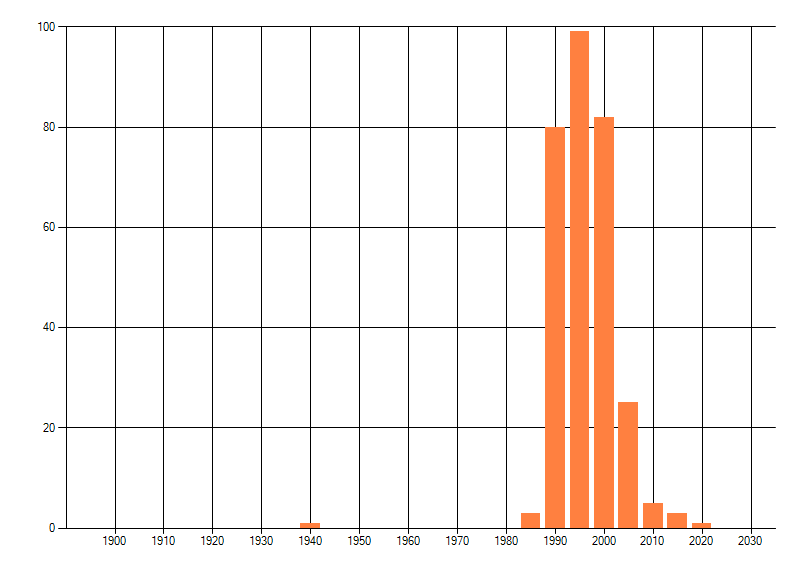 Het aantal atlasblokken (5x5 km) waarin de soort is gemeld binnen een periode van vijf jaar (vanaf 1980) of twintig jaar. Niet gecorrigeerd voor waarnemersinspanning en het aantal doorgegeven waarnemingen kan sterk variëren per periode, dus een trend in verspreiding kan hier niet direct uit worden afgelezen. Het opgegeven jaartal is het eerste jaar van de periode. Bron: gevalideerde waarnemingen uit de NDFF.