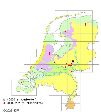 Het aantal atlasblokken (5x5 km) waarin de soort is gemeld binnen een periode van vijf jaar (vanaf 1980) of twintig jaar. Niet gecorrigeerd voor waarnemersinspanning en het aantal doorgegeven waarnemingen kan sterk variëren per periode, dus een trend in verspreiding kan hier niet direct uit worden afgelezen. Het opgegeven jaartal is het eerste jaar van de periode. Bron: gevalideerde waarnemingen uit de NDFF.