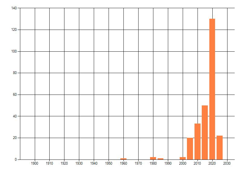 Het aantal atlasblokken (5x5 km) waarin de soort is gemeld binnen een periode van vijf jaar (vanaf 1980) of twintig jaar. Niet gecorrigeerd voor waarnemersinspanning en het aantal doorgegeven waarnemingen kan sterk variëren per periode, dus een trend in verspreiding kan hier niet direct uit worden afgelezen. Het opgegeven jaartal is het eerste jaar van de periode. Bron: gevalideerde waarnemingen uit de NDFF.
