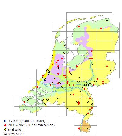 Het aantal atlasblokken (5x5 km) waarin de soort is gemeld binnen een periode van vijf jaar (vanaf 1980) of twintig jaar. Niet gecorrigeerd voor waarnemersinspanning en het aantal doorgegeven waarnemingen kan sterk variëren per periode, dus een trend in verspreiding kan hier niet direct uit worden afgelezen. Het opgegeven jaartal is het eerste jaar van de periode. Bron: gevalideerde waarnemingen uit de NDFF.