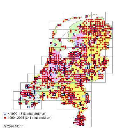 Het aantal atlasblokken (5x5 km) waarin de soort is gemeld binnen een periode van vijf jaar (vanaf 1980) of twintig jaar. Niet gecorrigeerd voor waarnemersinspanning en het aantal doorgegeven waarnemingen kan sterk variëren per periode, dus een trend in verspreiding kan hier niet direct uit worden afgelezen. Het opgegeven jaartal is het eerste jaar van de periode. Bron: gevalideerde waarnemingen uit de NDFF.