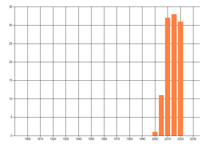 Het aantal atlasblokken (5x5 km) waarin de soort is gemeld binnen een periode van vijf jaar (vanaf 1980) of twintig jaar. Niet gecorrigeerd voor waarnemersinspanning en het aantal doorgegeven waarnemingen kan sterk variëren per periode, dus een trend in verspreiding kan hier niet direct uit worden afgelezen. Het opgegeven jaartal is het eerste jaar van de periode. Bron: gevalideerde waarnemingen uit de NDFF.