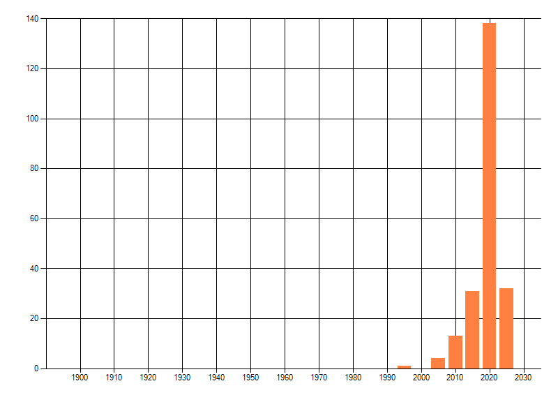 Het aantal atlasblokken (5x5 km) waarin de soort is gemeld binnen een periode van vijf jaar (vanaf 1980) of twintig jaar. Niet gecorrigeerd voor waarnemersinspanning en het aantal doorgegeven waarnemingen kan sterk variëren per periode, dus een trend in verspreiding kan hier niet direct uit worden afgelezen. Het opgegeven jaartal is het eerste jaar van de periode. Bron: gevalideerde waarnemingen uit de NDFF.