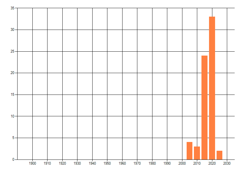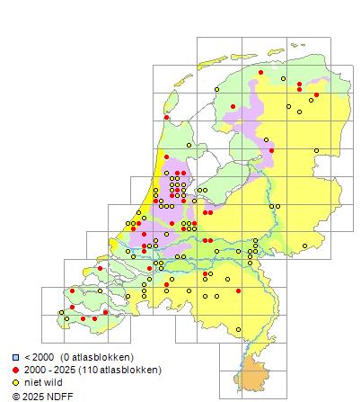 Het aantal atlasblokken (5x5 km) waarin de soort is gemeld binnen een periode van vijf jaar (vanaf 1980) of twintig jaar. Niet gecorrigeerd voor waarnemersinspanning en het aantal doorgegeven waarnemingen kan sterk variëren per periode, dus een trend in verspreiding kan hier niet direct uit worden afgelezen. Het opgegeven jaartal is het eerste jaar van de periode. Bron: gevalideerde waarnemingen uit de NDFF.
