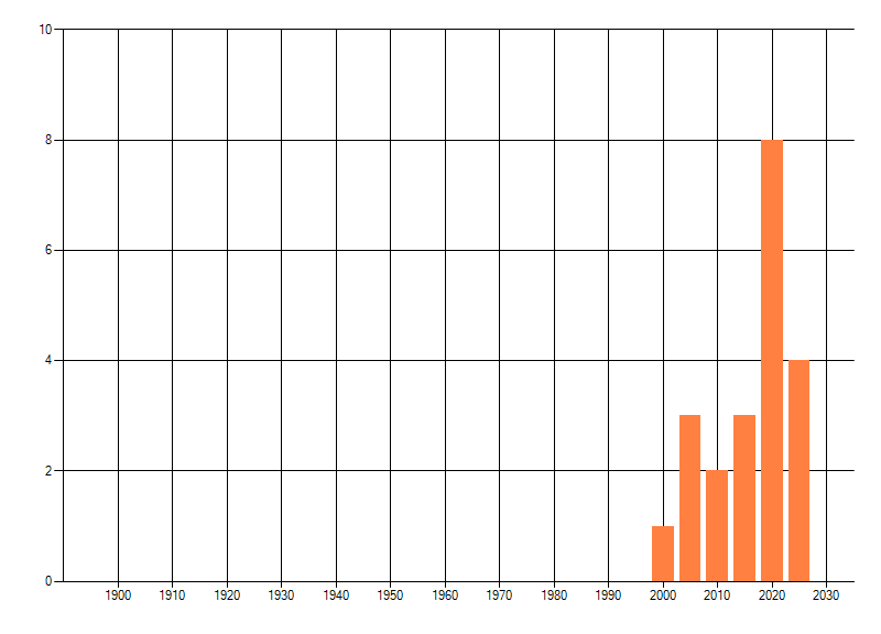 Het aantal atlasblokken (5x5 km) waarin de soort is gemeld binnen een periode van vijf jaar (vanaf 1980) of twintig jaar. Niet gecorrigeerd voor waarnemersinspanning en het aantal doorgegeven waarnemingen kan sterk variëren per periode, dus een trend in verspreiding kan hier niet direct uit worden afgelezen. Het opgegeven jaartal is het eerste jaar van de periode. Bron: gevalideerde waarnemingen uit de NDFF.