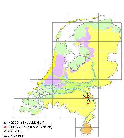 Het aantal atlasblokken (5x5 km) waarin de soort is gemeld binnen een periode van vijf jaar (vanaf 1980) of twintig jaar. Niet gecorrigeerd voor waarnemersinspanning en het aantal doorgegeven waarnemingen kan sterk variëren per periode, dus een trend in verspreiding kan hier niet direct uit worden afgelezen. Het opgegeven jaartal is het eerste jaar van de periode. Bron: gevalideerde waarnemingen uit de NDFF.