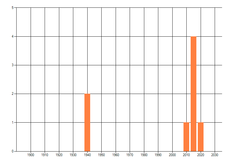 Het aantal atlasblokken (5x5 km) waarin de soort is gemeld binnen een periode van vijf jaar (vanaf 1980) of twintig jaar. Niet gecorrigeerd voor waarnemersinspanning en het aantal doorgegeven waarnemingen kan sterk variëren per periode, dus een trend in verspreiding kan hier niet direct uit worden afgelezen. Het opgegeven jaartal is het eerste jaar van de periode. Bron: gevalideerde waarnemingen uit de NDFF.