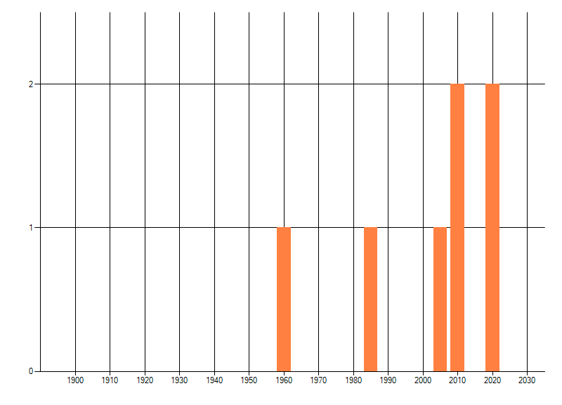 Het aantal atlasblokken (5x5 km) waarin de soort is gemeld binnen een periode van vijf jaar (vanaf 1980) of twintig jaar. Niet gecorrigeerd voor waarnemersinspanning en het aantal doorgegeven waarnemingen kan sterk variëren per periode, dus een trend in verspreiding kan hier niet direct uit worden afgelezen. Het opgegeven jaartal is het eerste jaar van de periode. Bron: gevalideerde waarnemingen uit de NDFF.