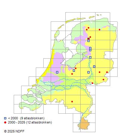 Het aantal atlasblokken (5x5 km) waarin de soort is gemeld binnen een periode van vijf jaar (vanaf 1980) of twintig jaar. Niet gecorrigeerd voor waarnemersinspanning en het aantal doorgegeven waarnemingen kan sterk variëren per periode, dus een trend in verspreiding kan hier niet direct uit worden afgelezen. Het opgegeven jaartal is het eerste jaar van de periode. Bron: gevalideerde waarnemingen uit de NDFF.
