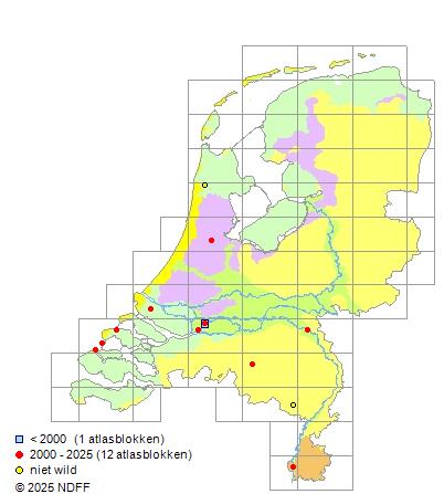 Het aantal atlasblokken (5x5 km) waarin de soort is gemeld binnen een periode van vijf jaar (vanaf 1980) of twintig jaar. Niet gecorrigeerd voor waarnemersinspanning en het aantal doorgegeven waarnemingen kan sterk variëren per periode, dus een trend in verspreiding kan hier niet direct uit worden afgelezen. Het opgegeven jaartal is het eerste jaar van de periode. Bron: gevalideerde waarnemingen uit de NDFF.