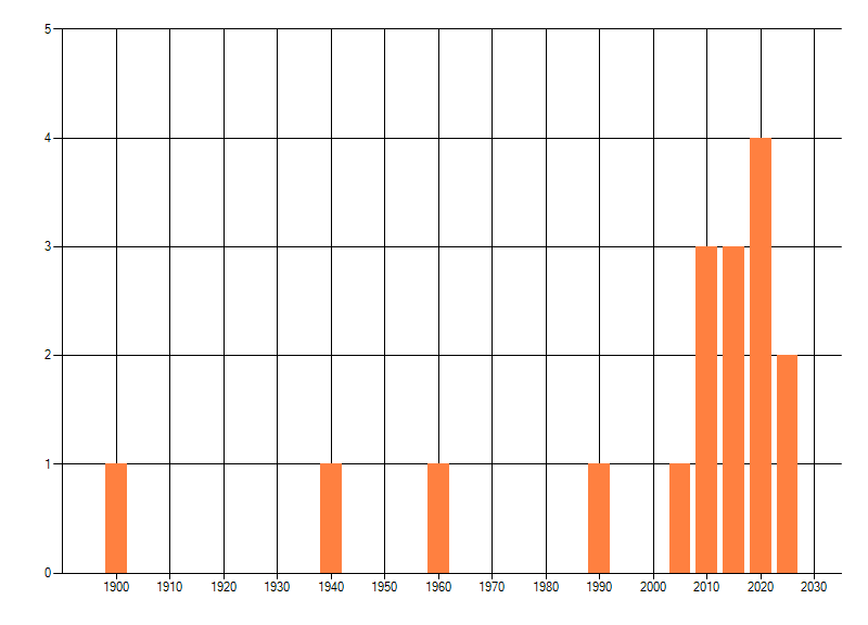 Het aantal atlasblokken (5x5 km) waarin de soort is gemeld binnen een periode van vijf jaar (vanaf 1980) of twintig jaar. Niet gecorrigeerd voor waarnemersinspanning en het aantal doorgegeven waarnemingen kan sterk variëren per periode, dus een trend in verspreiding kan hier niet direct uit worden afgelezen. Het opgegeven jaartal is het eerste jaar van de periode. Bron: gevalideerde waarnemingen uit de NDFF.