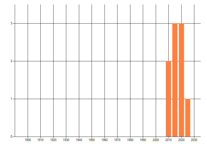 Het aantal atlasblokken (5x5 km) waarin de soort is gemeld binnen een periode van vijf jaar (vanaf 1980) of twintig jaar. Niet gecorrigeerd voor waarnemersinspanning en het aantal doorgegeven waarnemingen kan sterk variëren per periode, dus een trend in verspreiding kan hier niet direct uit worden afgelezen. Het opgegeven jaartal is het eerste jaar van de periode. Bron: gevalideerde waarnemingen uit de NDFF.