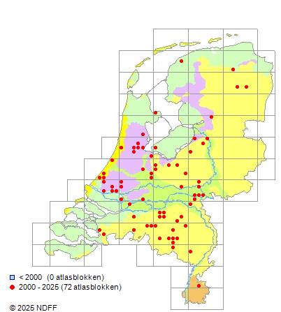 Het aantal atlasblokken (5x5 km) waarin de soort is gemeld binnen een periode van vijf jaar (vanaf 1980) of twintig jaar. Niet gecorrigeerd voor waarnemersinspanning en het aantal doorgegeven waarnemingen kan sterk variëren per periode, dus een trend in verspreiding kan hier niet direct uit worden afgelezen. Het opgegeven jaartal is het eerste jaar van de periode. Bron: gevalideerde waarnemingen uit de NDFF.