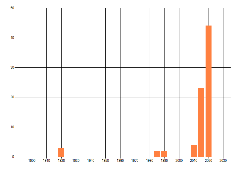 Het aantal atlasblokken (5x5 km) waarin de soort is gemeld binnen een periode van vijf jaar (vanaf 1980) of twintig jaar. Niet gecorrigeerd voor waarnemersinspanning en het aantal doorgegeven waarnemingen kan sterk variëren per periode, dus een trend in verspreiding kan hier niet direct uit worden afgelezen. Het opgegeven jaartal is het eerste jaar van de periode. Bron: gevalideerde waarnemingen uit de NDFF.