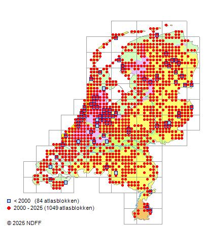 Het aantal atlasblokken (5x5 km) waarin de soort is gemeld binnen een periode van vijf jaar (vanaf 1980) of twintig jaar. Niet gecorrigeerd voor waarnemersinspanning en het aantal doorgegeven waarnemingen kan sterk variëren per periode, dus een trend in verspreiding kan hier niet direct uit worden afgelezen. Het opgegeven jaartal is het eerste jaar van de periode. Bron: gevalideerde waarnemingen uit de NDFF.