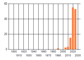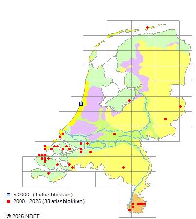 Het aantal atlasblokken (5x5 km) waarin de soort is gemeld binnen een periode van vijf jaar (vanaf 1980) of twintig jaar. Niet gecorrigeerd voor waarnemersinspanning en het aantal doorgegeven waarnemingen kan sterk variëren per periode, dus een trend in verspreiding kan hier niet direct uit worden afgelezen. Het opgegeven jaartal is het eerste jaar van de periode. Bron: gevalideerde waarnemingen uit de NDFF.