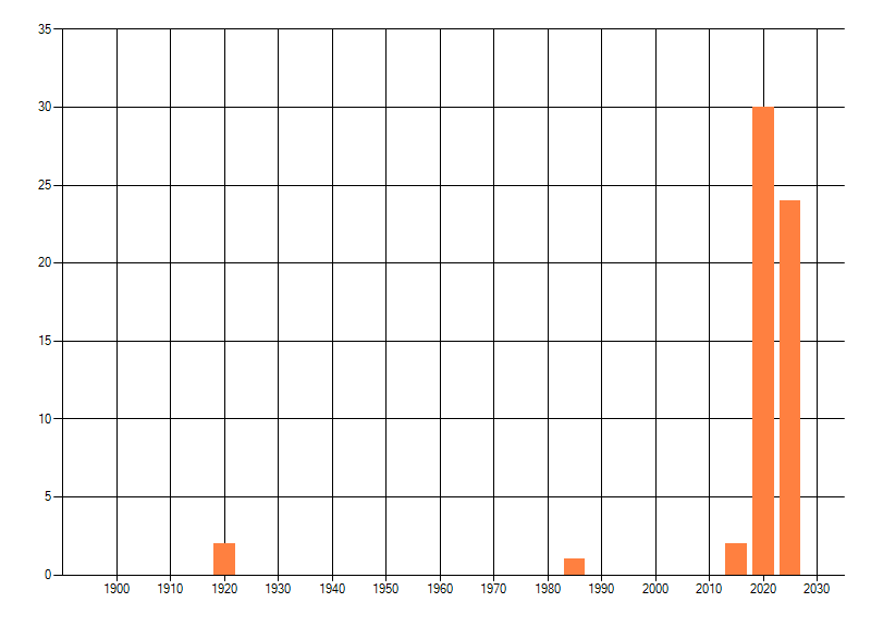 Het aantal atlasblokken (5x5 km) waarin de soort is gemeld binnen een periode van vijf jaar (vanaf 1980) of twintig jaar. Niet gecorrigeerd voor waarnemersinspanning en het aantal doorgegeven waarnemingen kan sterk variëren per periode, dus een trend in verspreiding kan hier niet direct uit worden afgelezen. Het opgegeven jaartal is het eerste jaar van de periode. Bron: gevalideerde waarnemingen uit de NDFF.