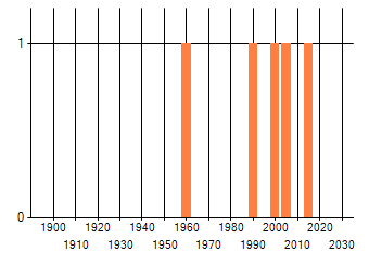 Het aantal atlasblokken (5x5 km) waarin de soort is gemeld binnen een periode van vijf jaar (vanaf 1980) of twintig jaar. Niet gecorrigeerd voor waarnemersinspanning en het aantal doorgegeven waarnemingen kan sterk variëren per periode, dus een trend in verspreiding kan hier niet direct uit worden afgelezen. Het opgegeven jaartal is het eerste jaar van de periode. Bron: gevalideerde waarnemingen uit de NDFF.