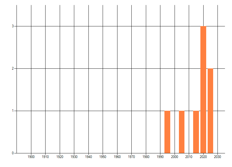 Het aantal atlasblokken (5x5 km) waarin de soort is gemeld binnen een periode van vijf jaar (vanaf 1980) of twintig jaar. Niet gecorrigeerd voor waarnemersinspanning en het aantal doorgegeven waarnemingen kan sterk variëren per periode, dus een trend in verspreiding kan hier niet direct uit worden afgelezen. Het opgegeven jaartal is het eerste jaar van de periode. Bron: gevalideerde waarnemingen uit de NDFF.
