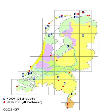Het aantal atlasblokken (5x5 km) waarin de soort is gemeld binnen een periode van vijf jaar (vanaf 1980) of twintig jaar. Niet gecorrigeerd voor waarnemersinspanning en het aantal doorgegeven waarnemingen kan sterk variëren per periode, dus een trend in verspreiding kan hier niet direct uit worden afgelezen. Het opgegeven jaartal is het eerste jaar van de periode. Bron: gevalideerde waarnemingen uit de NDFF.