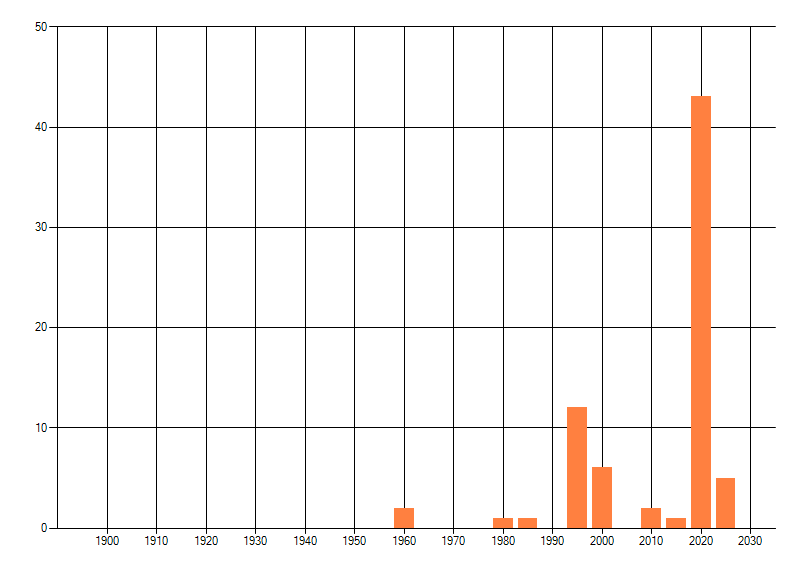 Het aantal atlasblokken (5x5 km) waarin de soort is gemeld binnen een periode van vijf jaar (vanaf 1980) of twintig jaar. Niet gecorrigeerd voor waarnemersinspanning en het aantal doorgegeven waarnemingen kan sterk variëren per periode, dus een trend in verspreiding kan hier niet direct uit worden afgelezen. Het opgegeven jaartal is het eerste jaar van de periode. Bron: gevalideerde waarnemingen uit de NDFF.
