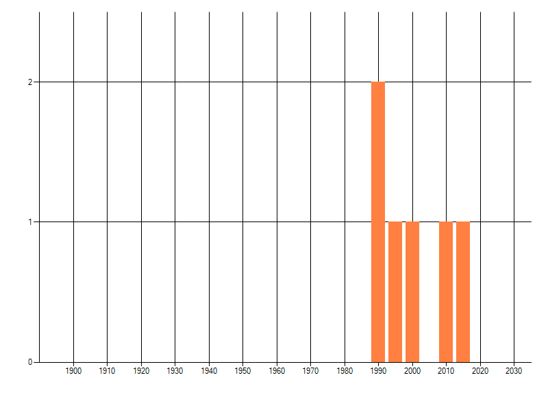 Het aantal atlasblokken (5x5 km) waarin de soort is gemeld binnen een periode van vijf jaar (vanaf 1980) of twintig jaar. Niet gecorrigeerd voor waarnemersinspanning en het aantal doorgegeven waarnemingen kan sterk variëren per periode, dus een trend in verspreiding kan hier niet direct uit worden afgelezen. Het opgegeven jaartal is het eerste jaar van de periode. Bron: gevalideerde waarnemingen uit de NDFF.