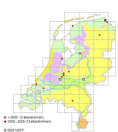 Het aantal atlasblokken (5x5 km) waarin de soort is gemeld binnen een periode van vijf jaar (vanaf 1980) of twintig jaar. Niet gecorrigeerd voor waarnemersinspanning en het aantal doorgegeven waarnemingen kan sterk variëren per periode, dus een trend in verspreiding kan hier niet direct uit worden afgelezen. Het opgegeven jaartal is het eerste jaar van de periode. Bron: gevalideerde waarnemingen uit de NDFF.